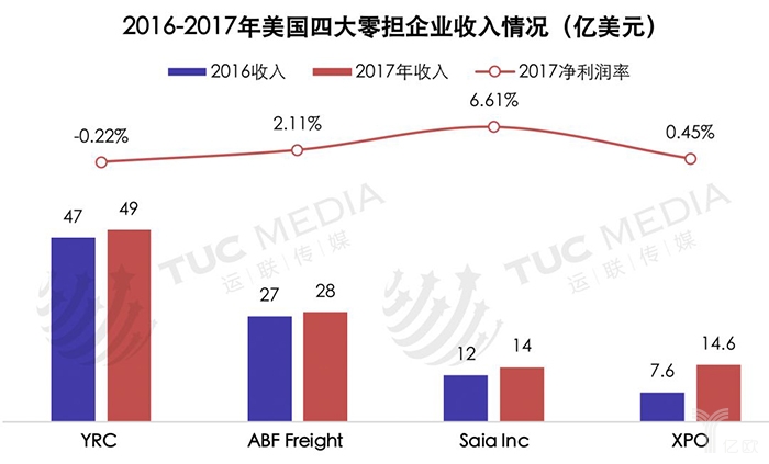 除FedEx外,其他大零擔(dān)企業(yè)(如YRC、ABF、Saia、XPO)近幾年收入處于持續(xù)增長階段,市場規(guī)模逐步擴(kuò)大,自身實力不斷加強。