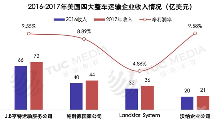 美國物流整車領(lǐng)域受益于近年來隨美國經(jīng)濟(jì)的平穩(wěn)形勢,企業(yè)收入一直處于小幅平穩(wěn)增長趨勢。在行業(yè)巨頭滲透下,美國四大整車企業(yè)行業(yè)優(yōu)勢依然明顯,市場空間沒有下降,收入反而小幅度上升,利潤保持相對較高的水平。