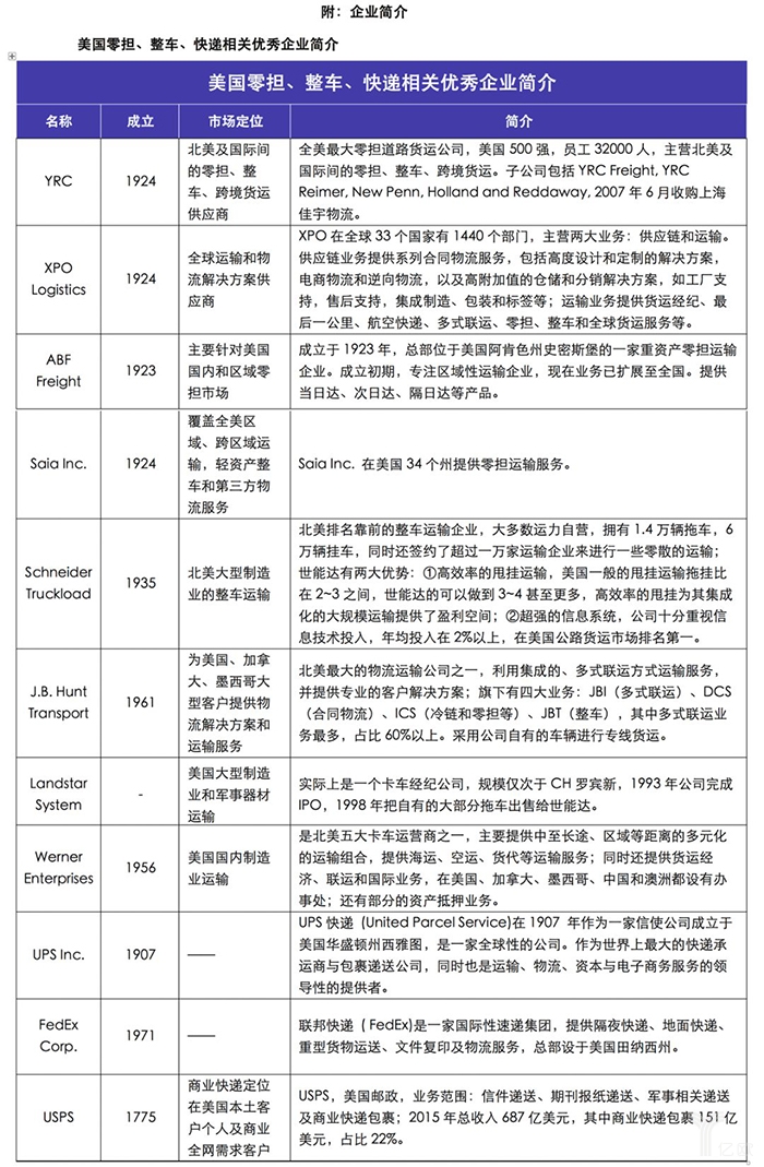 物流行業(yè)按貨物運輸批量的不同可簡單分為整車運輸、零擔(dān)運輸和快遞三大類。美國物流行業(yè)三大運輸形式中各有巨頭企業(yè)占領(lǐng)了大部分市場份額,相互競爭又差異化共處,表現(xiàn)十分搶眼。
