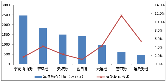 圖3 主要港口集裝箱吞吐量和鐵水聯運量占比情況(2017年)