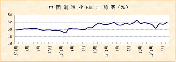 中國物流與采購聯合會、國家統計局服務業調查中心發布的2018年5月份中國制造業采購經理指數(PMI)為51.9%,較上月上升0.5個百分點。從主要分項指數來看,供需等主要指數均有所上升,顯著高于去年同期。綜合來看,經濟內生動力增強,質量持續提升,抗短期波動的韌性增強,整體運行態勢穩健。