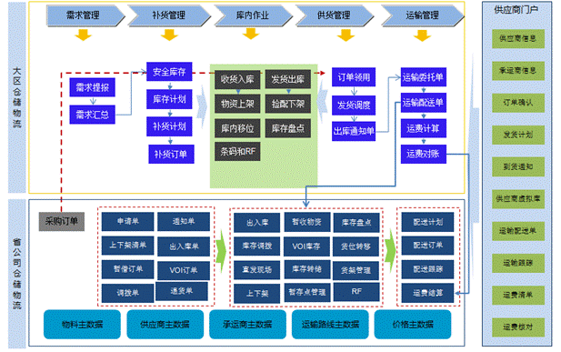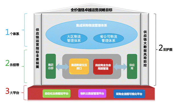一個體系:通過構建集成采購物流管理體系,實現大區物流和省公司物流管理端到端的運營支撐,并通過引入先進技術提升物流管理的現代化水平,從而建立集約高效的供應鏈物流管理平臺。