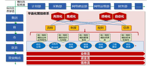 通過統一物料分類和物料編碼,實現對“橫向流程貫通、縱向信息穿透”的“平面化管控體系”的有力支撐。橫向徹底打通了橫向業務流程,縱向使得每個管理層級都可以隨時了解和掌握下屬單位的業務運行情況,提高了業務決策信息的透明度和可視性。
