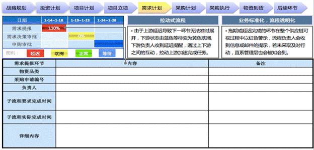 各部門可以直觀的看到采購項目進度狀態,以采購過程中的需求計劃、采購計劃、采購執行、物資到貨為例,對過程可視化進行詳細分解,涵蓋每個環節的周期分配以及通過色彩管理直觀體現進度狀態;每一個流程進度都可以深層展開得到具體的信息。