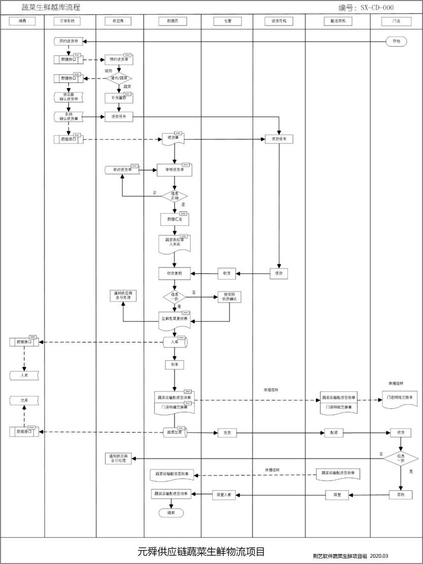 本流程描述元舜蔬菜生鮮業(yè)務(wù),從供應(yīng)商報(bào)送生鮮商品送貨單開始,到司機(jī)帶回門店交接明細(xì)單結(jié)束。主要涉及生鮮商品收貨入庫,裝車復(fù)核,越庫發(fā)貨,門店簽收確認(rèn)等業(yè)務(wù)操作。