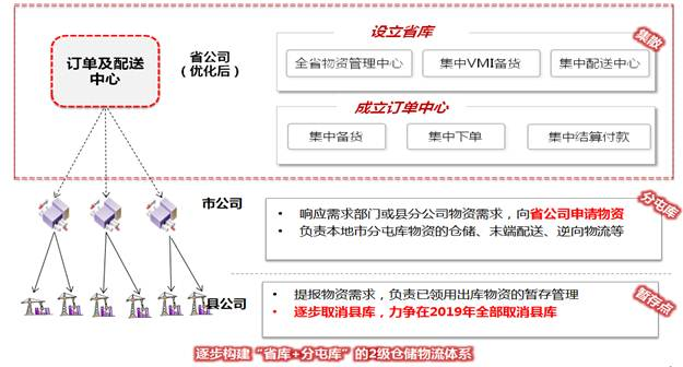 1)設立省級倉儲配送中心:集中存放供應商VMI備貨物資,響應地市批量備貨需求,集中配送至市分屯庫,具備集貨、備貨、儲存、配貨、加工等主要功能;