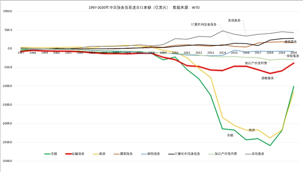 然而,當打開服務貿易的結構來看時,服務貿易的進出口差額依然很大,長期處于逆差的狀態。其中,運輸、旅行、知識產權使用費、是近年來最主要的逆差項,國際運輸服務貿易的長期逆差性,與我國貨物貿易出口大于進口、長期順差的態勢嚴重不相符。