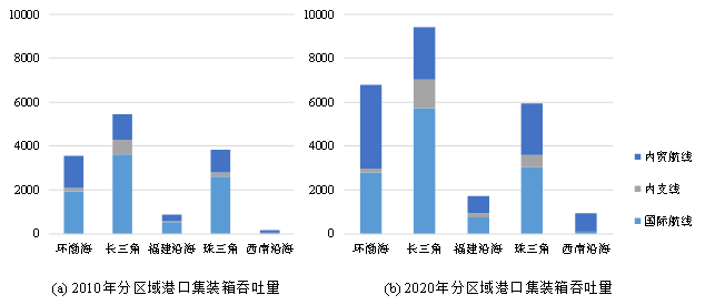 圖1 2010年、2020年我國沿海港口集裝箱吞吐量分區域結構(單位:萬TEU)