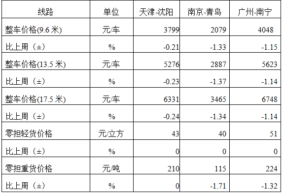 分車型看,各車型指數(shù)環(huán)比繼續(xù)回落。其中,整車指數(shù)為1051.21點(diǎn),比上周回落0.14%;零擔(dān)輕貨指數(shù)為1027.50點(diǎn),比上周回落0.01%;零擔(dān)重貨指數(shù)為1051.88點(diǎn),比上周回落0.11%。