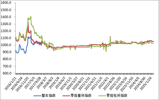 分車型看,各車型指數環比漲跌互現。其中,整車指數為1051.44點,比上周回升0.02%;零擔輕貨指數為1027.43點,比上周回落0.01%;零擔重貨指數為1052.11點,比上周回升0.02%。