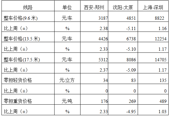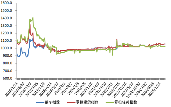 分車型看,各車型指數環比略有回升。其中,整車指數為1056.77點,比上周回升0.11%;零擔輕貨指數為1026.69點,比上周回升0.01%;零擔重貨指數為1056.56點,比上周回升0.02%。