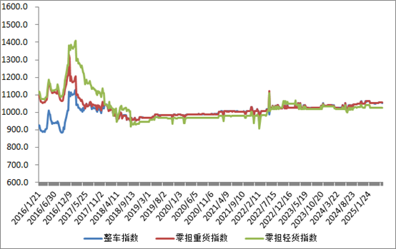 分車型看,各車型指數環比漲跌互現。其中,整車指數為1054.67點,比上周回落0.12%;零擔輕貨指數為1026.43點,比上周回落0.01%;零擔重貨指數為1055.75點,比上周回落0.30%。