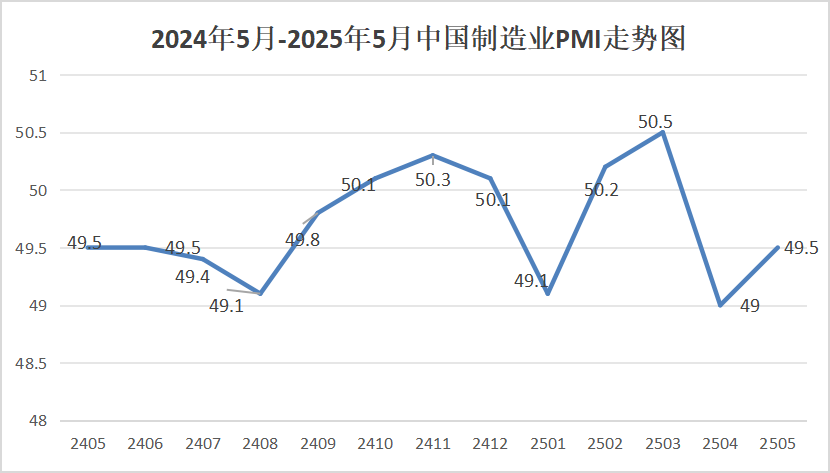 中國物流與采購聯(lián)合會(huì)、國家統(tǒng)計(jì)局服務(wù)業(yè)調(diào)查中心發(fā)布的2025年5月份中國制造業(yè)采購經(jīng)理指數(shù)(PMI)為49.5%,比上月上升0.5個(gè)百分點(diǎn)。