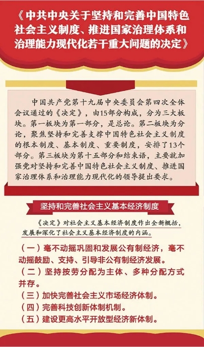 ??黨的十九屆四中全會(huì)聚焦堅(jiān)持和完善支撐中國(guó)特色社會(huì)主義制度的根本制度、基本制度、重要制度,首次將按勞分配為主體、多種分配方式并存和社會(huì)主義市場(chǎng)經(jīng)濟(jì)體制納入基本經(jīng)濟(jì)制度,進(jìn)一步拓展了我國(guó)基本經(jīng)濟(jì)制度的內(nèi)涵。