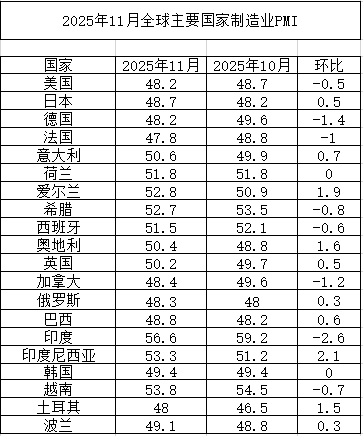 2025年11月全球主要國家制造業(yè)PMI