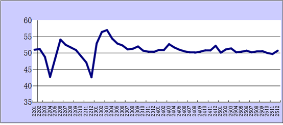 其中,2025年12月份,制造業(yè)生產(chǎn)指數(shù)為51.7%,較上月上升1.7個百分點;非制造業(yè)商務(wù)活動指數(shù)為50.2%,較上月上升0.7個百分點。
