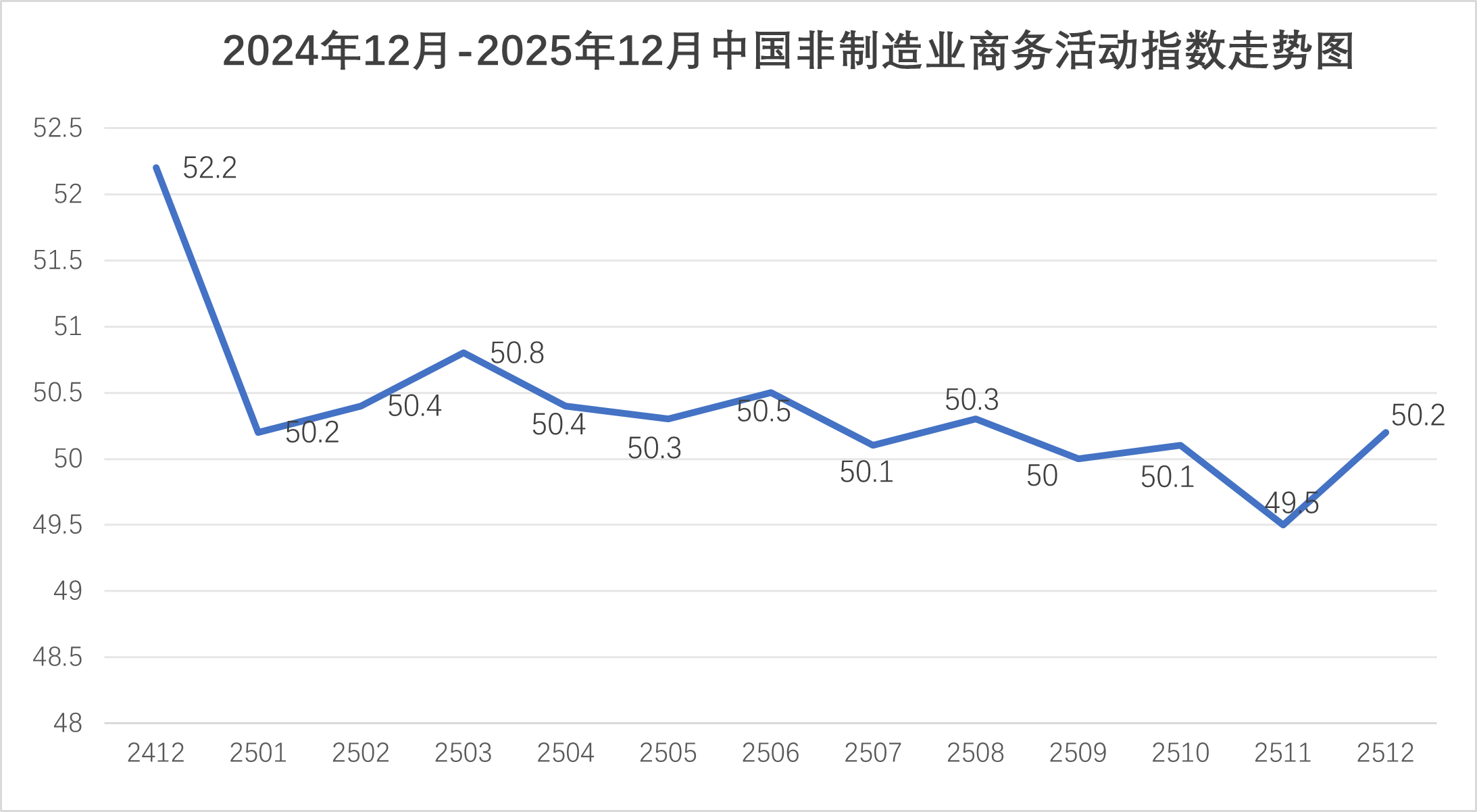 國家統計局服務業調查中心、中國物流與采購聯合會發布的2025年12月份中國非制造業商務活動指數為50.2%,環比上升0.7個百分點。由于非制造業沒有綜合指數,通常以商務活動指數來反映非制造業經濟的總體變化。