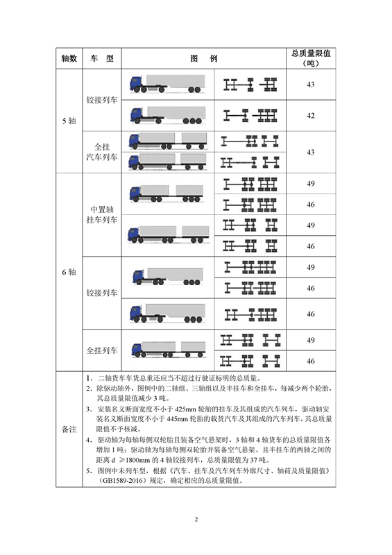 (一)統(tǒng)一車貨總重限值認(rèn)定標(biāo)準(zhǔn)。自2016年9月21日起,對(duì)于公路貨運(yùn)車輛,各地交通運(yùn)輸、公安部門要嚴(yán)格按照強(qiáng)制性國(guó)家標(biāo)準(zhǔn)《汽車、掛車及汽車列車外廓尺寸、軸荷及質(zhì)量限值》(GB1589)規(guī)定的最大允許總質(zhì)量限值,認(rèn)定車輛車貨總重是否超限超載,并據(jù)此進(jìn)行檢查和執(zhí)法(詳見附件),其中,二軸貨車車貨總重還應(yīng)當(dāng)不超過行駛證標(biāo)明的總質(zhì)量。