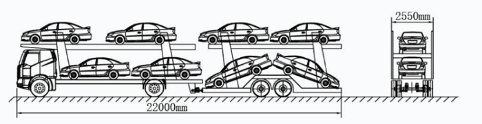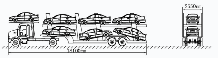 3.中置軸車輛運輸車裝載9輛以上的,嚴格執行裝載長度不得超過22米、寬度不得超過2.55米、高度不得超過4米的要求。不符合要求的,公安交通管理部門依據《道路交通安全法》第九十條、《道路交通安全法實施條例》第五十四條規定,處警告或者二十元以上二百元以下罰款、記分,并根據《行政處罰法》第二十八條責令當事人改正違法行為。若裝載乘用車車型較小,上層單排平放5輛車(不得上下左右傾斜)前后均不超過車輛運輸車外廓尺寸的,可允許裝載9輛車。