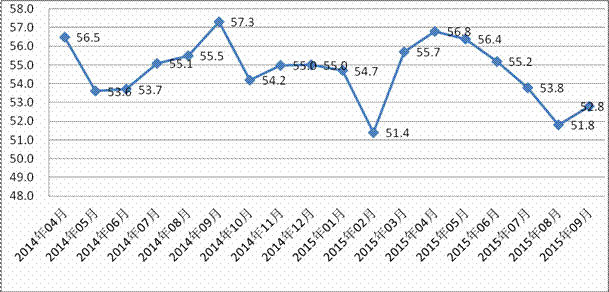 圖2014年4月-2015年9月福建省物流業(yè)景氣指數(shù)(LPI)走勢