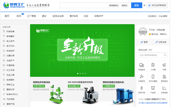 相比于農業電商等新興的B2B市場,工業品電商發展由來已久。國內知名的工業品電商平臺世界工廠網,在2009年已經完成上線。經過長時間的發展,工業品電商市場也逐漸形成了兩種截然不同的類型:一種是綜合類B2B電子商務平臺,覆蓋行業廣,比如阿里巴巴、慧聰網;一種是行業垂直類B2B電子商務網站,專業程度高,即針對一個行業做深、做透,比如中國化工網等。不過隨著世界工廠網V3版的上線,工業品電商也出現了第三種類型:既能深入行業,又能服務更廣泛群體的B2B電子商務平臺。