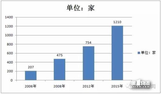 經核實,截至本次調查結束,全國包括運營、在建和規劃的各類物流園區共計1210家,比2006年的207家增長484%;與2008年的475家相比,增長155%;與2012年的754家相比,增長60%。如下圖所示: