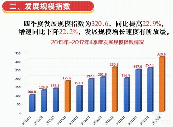 從四個一級指標來看,2017年四季度發展規模指數為320.6,同比提高22.9%。四季度,網絡購物所產生的快遞量占快遞業務總量的近七成,比三季度提高近10個百分點;全國快遞業務量約完成126.6億件,同比增長24.3%,占全年的比重達31.6%,為全年最高;日均快件處理量接近1.4億件,“雙11”期間最高日處理量3.3億件,同比增長31.5%。