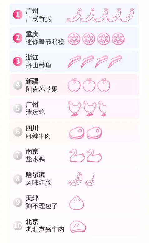 在所有地方的特產(chǎn)中,廣式香腸憑借銷量冠軍成為當之無愧的“國民年貨”。此外,重慶奉節(jié)臍橙、浙江舟山帶魚、新疆阿克蘇蘋果、廣州清遠雞緊跟其后。在最受全國用戶喜愛的十大地產(chǎn)特產(chǎn)年貨中,來自南方的六款特產(chǎn)榜上有名。北方區(qū)域特產(chǎn)來看,哈爾濱風味紅腸、天津狗不理包子、北京的醬牛肉亦受到全國用戶喜愛。