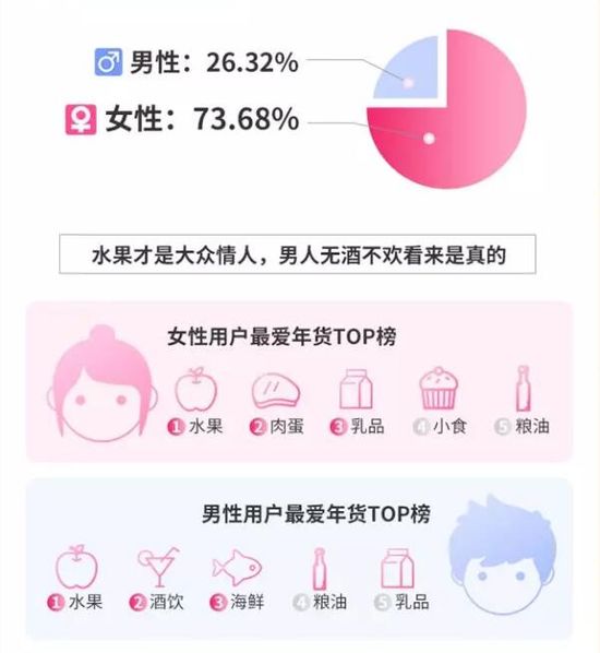 報告顯示,有超過七成的女性用戶購買年貨。而女性用戶最愛水果、肉蛋、乳品類年貨,男性用戶則更喜歡酒水、海鮮類產(chǎn)品。