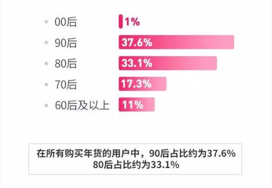 數(shù)據(jù)還顯示,2018年生鮮年貨的購買用戶多集中在80后、90后群體。其中,90后占比約37.6%,80后占比33.1%。