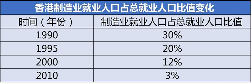 1980年,香港制造業(yè)到達巔峰時刻,公開數(shù)據(jù)顯示,就業(yè)人口占總就業(yè)人口的比值比值約42%。但就在這時,香港開始放棄制造業(yè),這其中的原因,既有受重貿(mào)易輕工業(yè)的英美傳統(tǒng)的影響,也反應(yīng)了香港社會底層勤奮務(wù)實的廣府文化開始衰退的跡象。在內(nèi)地改革開放的浪潮推動下,香港的企業(yè)家開始逐步將工廠內(nèi)遷到內(nèi)地(主要是語言文化比較接近的珠三角),通過內(nèi)地的三來一補政策,極大縮減了生產(chǎn)成本,而工廠生產(chǎn)的成品,再通過陸路運返香港,最后通過維多利亞港分撥至全球各地。到了1985年,香港的轉(zhuǎn)口貿(mào)易已經(jīng)超過本土的出口,香港經(jīng)濟開始逐漸轉(zhuǎn)入空心化。轉(zhuǎn)口貿(mào)易模式讓香港的流通業(yè)攀上了一個個新的高峰,但制造業(yè)的時代卻一去不返了,這點從香港制造業(yè)就業(yè)人口的變化可以看得到。