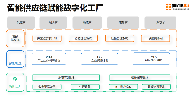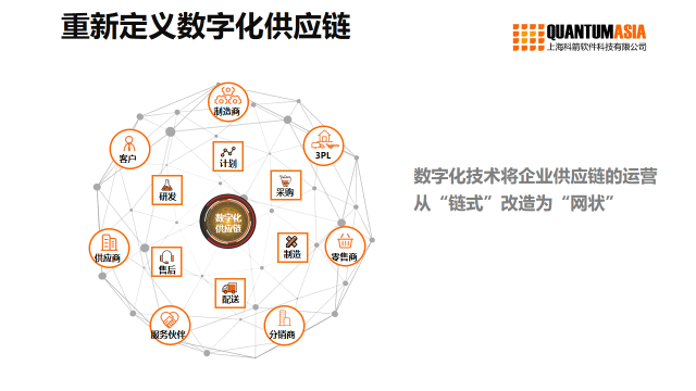 智能供應鏈,數字化是基礎。制造業必須將產品研發、原料采購、生產制造、配送運輸、客戶服務等環節都完全數字化,這樣就可以為所有的參與者從原材料、零部件和總成的供應商,到完成供應和成品的倉儲及運輸過程的物流商,以及服務最終客戶的經銷商及服務商,提供完全透明的,完整的數字化網絡。