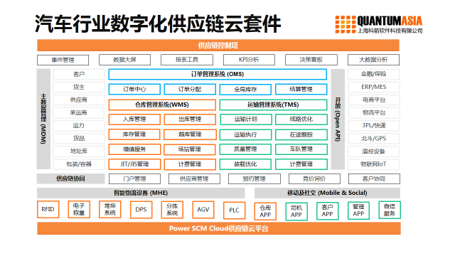 - 智能供應鏈,建立高效的智能供應鏈體系必須借助以下供應鏈技術來實現, 1)供應鏈需求計劃 2) 倉儲管理系統 3)運輸管理系統 4) 供應商協同。供應鏈數字化能夠加強汽車企業的供應鏈靈活性,更快速地響應市場變化,使企業更貼近客戶需求。這將能提高企業的客戶服務水平,降低庫存與生產成本。
