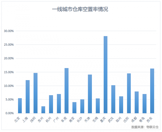 相較于全國其他一線城市倉庫空置率數據(如圖4),上海地區倉庫平均空置率為12%左右,低于重慶、深圳、東莞、天津、沈陽、西安等地區,處于全國一線城市中倉庫空置率偏高水平。
