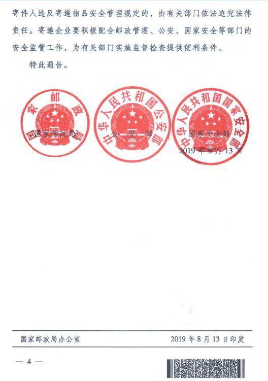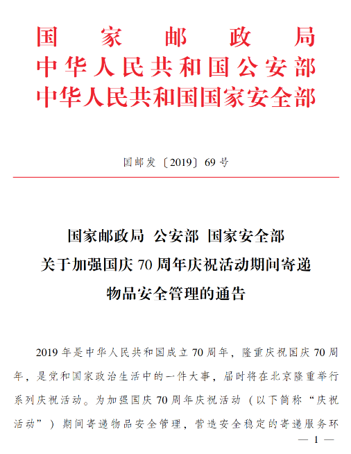 國慶70周年慶祝活動期間寄遞物品安全管理的通告