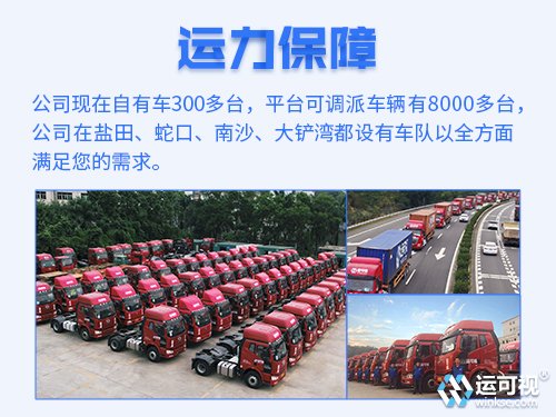 擁有強大的運力支撐,價格穩定。運可現在自有車300多臺,平臺可調派車輛有8000多臺,在深圳各個港口:鹽田、蛇口、南沙、大鏟灣設有車隊,同時,在運可視平臺上能夠真實反映出價格,費用清晰透明,保證車輛的同時,長年協議價格,就算旺季也不加價!