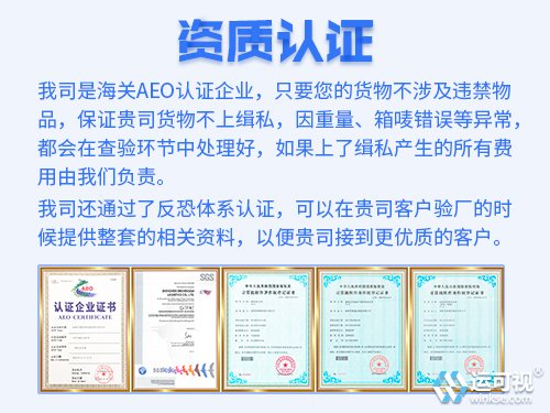 專業性強,服務有保障。平臺自主研發,取得諸多軟件著作權,同時運可視同過了AEO認證,在報關方面,只要貨物符合要求,運可視保障報關時效,處理好每個查驗環節。同時,運可視還通過了反恐體系認證,可為相關客戶驗廠時提供整套的相關資料,以便進出口企業、外貿公司接到更優質的客戶。