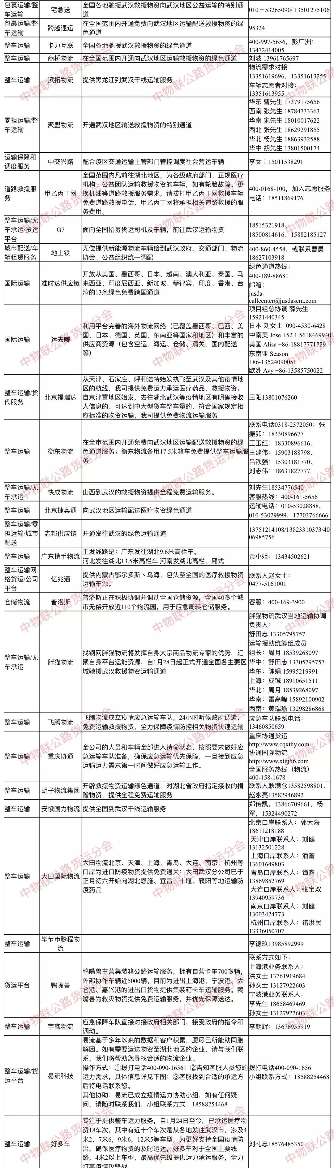 一方有難、八方支援,湖北武漢疫情牽動著廣大貨運物流人的心。目前,已經有50多家星級車隊和貨運物流企業正式提供疫情防控物資運輸保障服務,為疫情防控物資提供免費運輸和物流業務。為加強供需信息對接、團結形成合力,中物聯公路貨運分會特整理匯總了“疫情防控物資運輸保障資源信息一覽表”,請有相關運輸需求的單位和企業撥打專項聯系電話,具體對接運輸保障事宜。