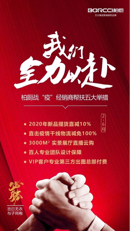 為了積極響應(yīng)國家號召,主動承擔(dān)社會責(zé)任,一直以中華傳統(tǒng)文化為企業(yè)文化的儒商柏廚“義利同擔(dān)”,為切實(shí)減輕經(jīng)銷商朋友近期經(jīng)營壓力,保障消費(fèi)者、經(jīng)銷商及員工的健康和利益,在不見硝煙的戰(zhàn)場里,聚力發(fā)力,執(zhí)行戰(zhàn)“疫”五大舉措,多方位“幫”“賦”,與經(jīng)銷商共扛壓。自2020年2月10日起至2020年6月30日,新品出廠價格直降10%,用于緩解經(jīng)銷商緊張的經(jīng)濟(jì)情況,穩(wěn)定經(jīng)濟(jì)局勢;疫情主干線物流運(yùn)費(fèi)減免100%用于支持國家抗“疫”戰(zhàn)的同時減輕經(jīng)銷商的負(fù)擔(dān);疫情期VIP客戶專業(yè)第三方出圖由總部付費(fèi),幫助經(jīng)銷商維系優(yōu)質(zhì)客戶資源,保證良好經(jīng)營、穩(wěn)定發(fā)展,保障經(jīng)銷商的自我營銷能力;疫情期間共享總部百人設(shè)計(jì)團(tuán)隊(duì)資源,賦能“云”設(shè)計(jì)。設(shè)計(jì)是家居的靈魂,消費(fèi)者滿意的設(shè)計(jì)是經(jīng)銷商與廠家柏廚共同的目標(biāo),總部極力支持優(yōu)秀設(shè)計(jì)作品面世;疫情期間將有3000㎡實(shí)景展示網(wǎng)絡(luò)直播,為經(jīng)銷商帶來巨大客戶流量,創(chuàng)新營銷模式賦能云零售。