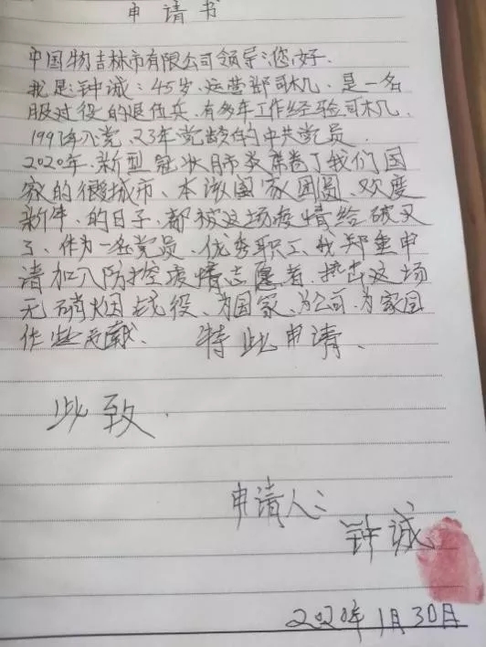 中國物流吉林公司的司機鐘誠是一名有著23年黨齡的老黨員,也是一名服過役的退伍軍人,在新冠肺炎疫情下,他主動向公司提交了書面申請書,申請加入防控疫情志愿者,為防疫工作做出貢獻,充分體現黨員敢于迎難而上不畏難的優秀品質,發揮先鋒模范帶頭作用。