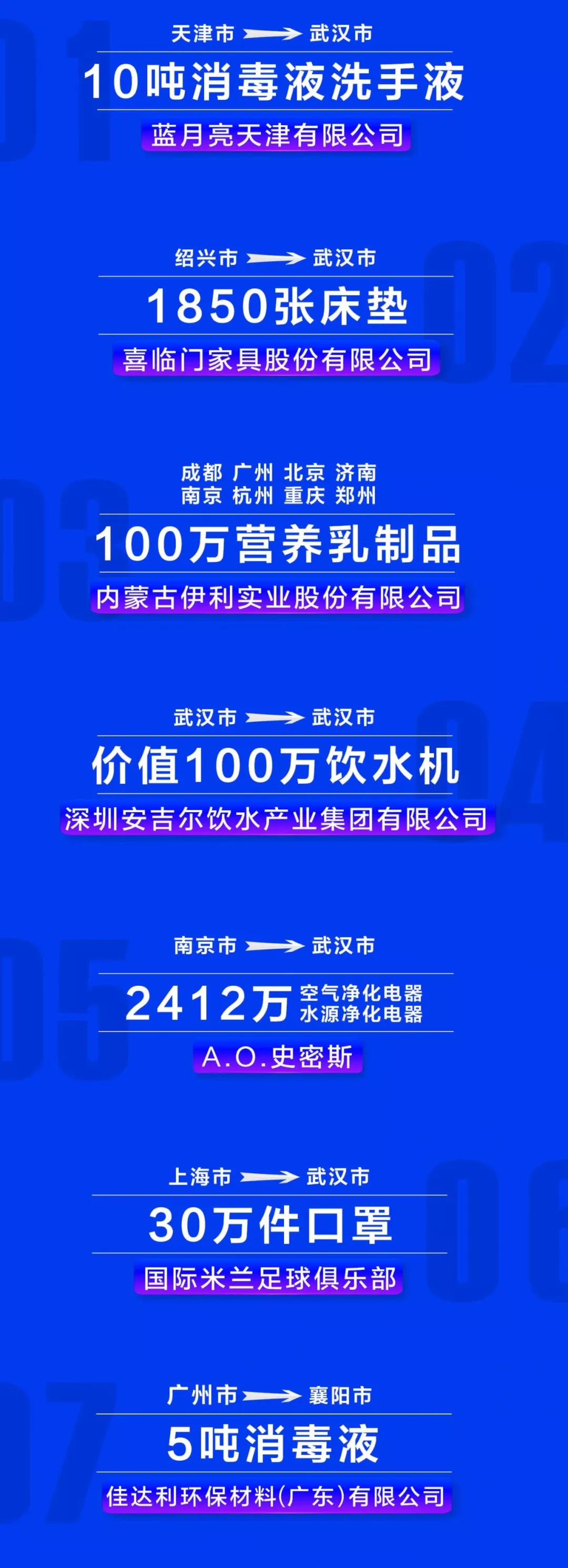 與此同時,眾多企業還攜手當地的慈善基金會馳援武漢。蘇寧物流相繼完成了中國光華科技基金會、白求恩公益基金會、凱爾翎公益基金會、愛德基金會、浙江省婦女兒童基金會、上海大會公益基金會、欣鑫慈善、江蘇省江陰市慈善總會等組織機構援助物資的免費承運。