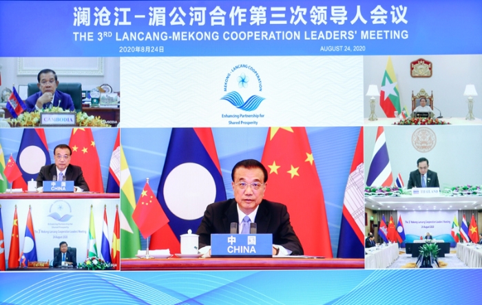 國(guó)務(wù)院總理李克強(qiáng)8月24日上午在人民大會(huì)堂出席瀾滄江—湄公河合作第三次領(lǐng)導(dǎo)人視頻會(huì)議。李克強(qiáng)和老撾總理通倫共同主持會(huì)議。柬埔寨首相洪森、緬甸總統(tǒng)溫敏、泰國(guó)總理巴育、越南總理阮春福出席。