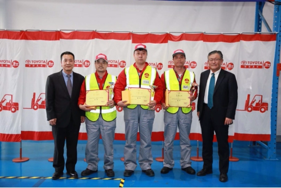 最終,經過6個多小時緊張而激烈的角逐,來自大連豐田的時春偉脫穎而出,摘得本次大賽冠軍頭銜,安徽錦力的徐飛與武漢弘陸的蔣利平分獲第二、三名,豐田產業車輛(上海)有限公司總經理山村圭彌先生、售后服務部部長元澤奎先生分別為獲獎選手頒發獎杯、證書以及獎品,并合影留念,豐田叉車第三屆全國技能大賽圓滿落幕。