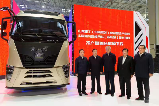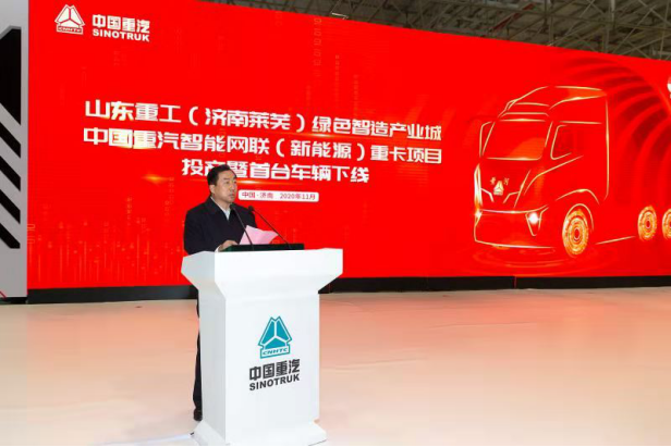 2020年11月19日上午9時(shí),山東重工(濟(jì)南萊蕪)綠色智造產(chǎn)業(yè)城—中國(guó)重汽智能網(wǎng)聯(lián)(新能源)重卡項(xiàng)目投產(chǎn)暨首臺(tái)車輛下線儀式在該項(xiàng)目總裝車間隆重舉行。隨著屏幕緩緩開(kāi)啟,一輛剛剛組裝下線的新一代黃河重卡緩緩駛到舞臺(tái)中央,標(biāo)志著中國(guó)重汽智能網(wǎng)聯(lián)(新能源)重卡項(xiàng)目正式投產(chǎn)。