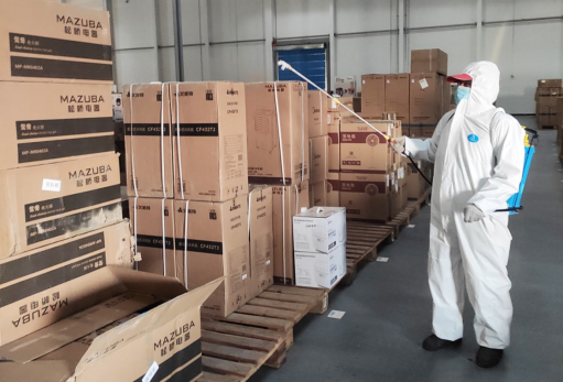 (長春蘇寧朝陽物流中心小家電倉正在消毒)