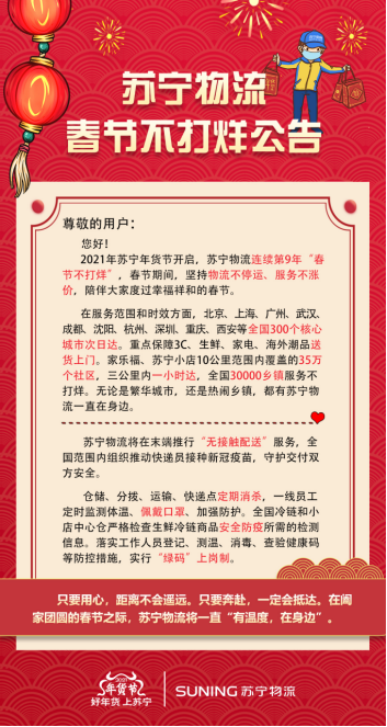 近日,蘇寧物流發布“春節不打烊”公告,宣布正式開啟第九年“春節不打烊”,將以全方位的防疫措施,為用戶提供與平日無差別的物流配送服務,以高品質服務保障消費者“就地過年”。