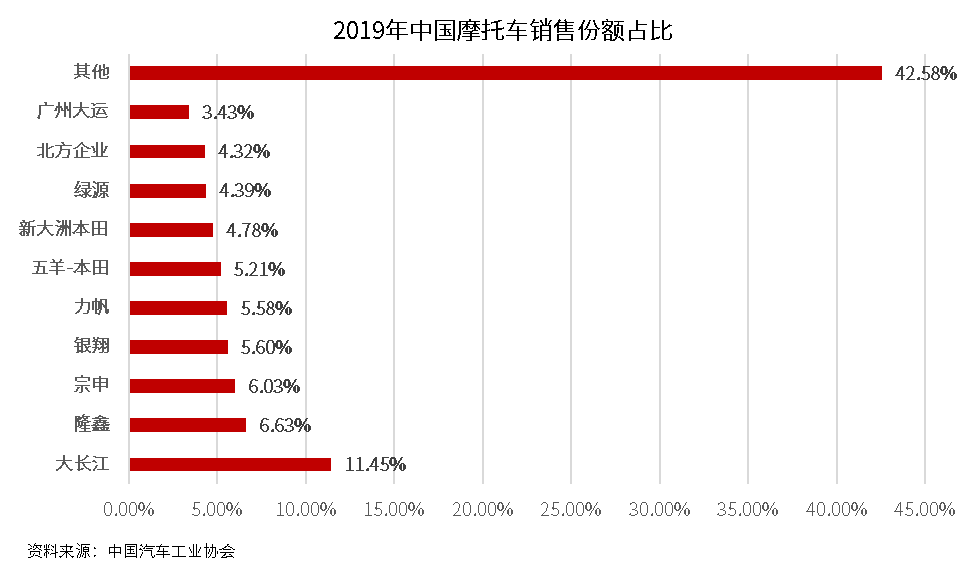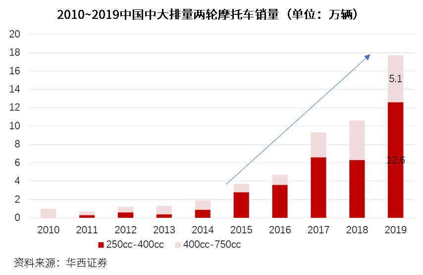 在摩托車市場(chǎng)面臨下行壓力之際,摩托車市場(chǎng)迎來轉(zhuǎn)型期。中汽協(xié)數(shù)據(jù)顯示,我國(guó)仍然是全球第二大摩托車市場(chǎng),2019年產(chǎn)銷超過1700萬輛;得益于我國(guó)居民消費(fèi)水平的提升,摩托車的主要用途正逐步由代步工具/生產(chǎn)資料向休閑、娛樂功能轉(zhuǎn)變,產(chǎn)品升級(jí)快速推進(jìn),自主、合資品牌車型不斷涌現(xiàn),平均價(jià)格顯著提升;特別是250cc排量以上的中高端摩托車銷量正在急速增長(zhǎng),成為了摩托車市場(chǎng)細(xì)分領(lǐng)域的香餑餑。