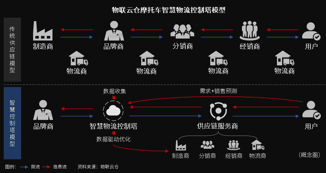 針對(duì)以上提到的摩托車物流中的特定需求特點(diǎn)來看,目前市場(chǎng)上已有物聯(lián)云倉(cāng)此類提供摩托車智慧物流解決方案的服務(wù)案例能夠作為行業(yè)參考,以啟發(fā)摩托車行業(yè)的物流智慧化升級(jí)變革。物聯(lián)云倉(cāng)成功幫助了某頭部摩托車品牌商從頂層設(shè)計(jì)層面構(gòu)建起了智慧物流控制塔模型,全面激發(fā)提升了摩托車物流干倉(cāng)配整體效能,實(shí)現(xiàn)了企業(yè)物流的資源能力與用戶需求的平衡。并且,物聯(lián)云倉(cāng)已在某頭部摩托車品牌商服務(wù)經(jīng)驗(yàn)的基礎(chǔ)上,錘煉出了一整套摩托車行業(yè)智慧物流解決方案。