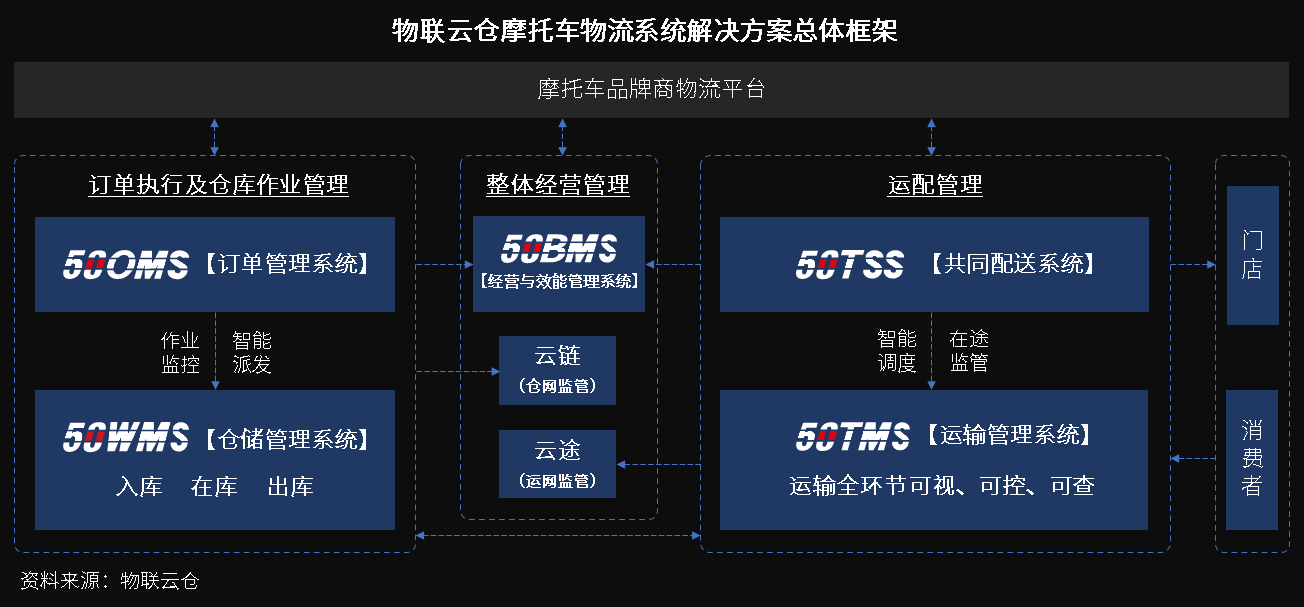 與此同時(shí),摩托車物流的倉(cāng)儲(chǔ)與配送標(biāo)準(zhǔn)服務(wù)借由物聯(lián)云倉(cāng)覆蓋物流全環(huán)節(jié)的物流SaaS系統(tǒng)加持,形成“科技驅(qū)動(dòng)物流高效運(yùn)轉(zhuǎn)”的格局,物聯(lián)云倉(cāng)50WMS倉(cāng)儲(chǔ)管理系統(tǒng)、50TMS運(yùn)輸管理系統(tǒng)、50TSS共同配送系統(tǒng)等物流科技系統(tǒng)一方面促使摩托車倉(cāng)儲(chǔ)、運(yùn)配等各節(jié)點(diǎn)環(huán)節(jié)的高速運(yùn)轉(zhuǎn),另一方面也使得物流各節(jié)點(diǎn)之間的銜接配合更為緊密快速。