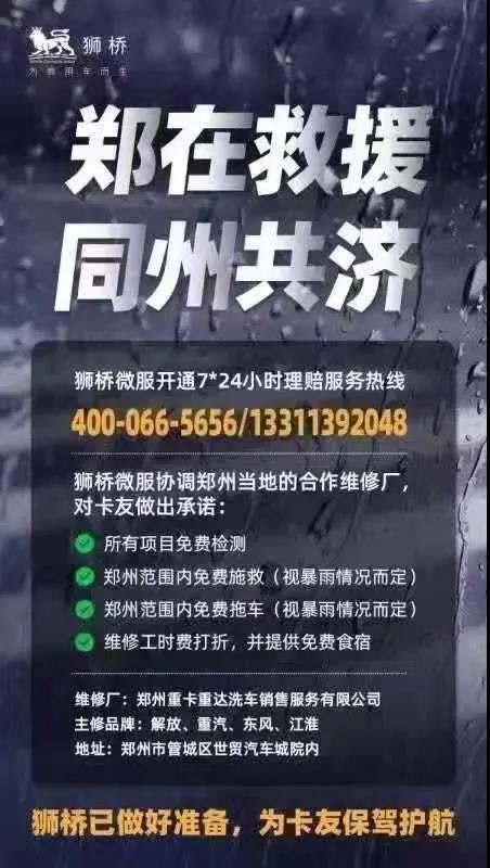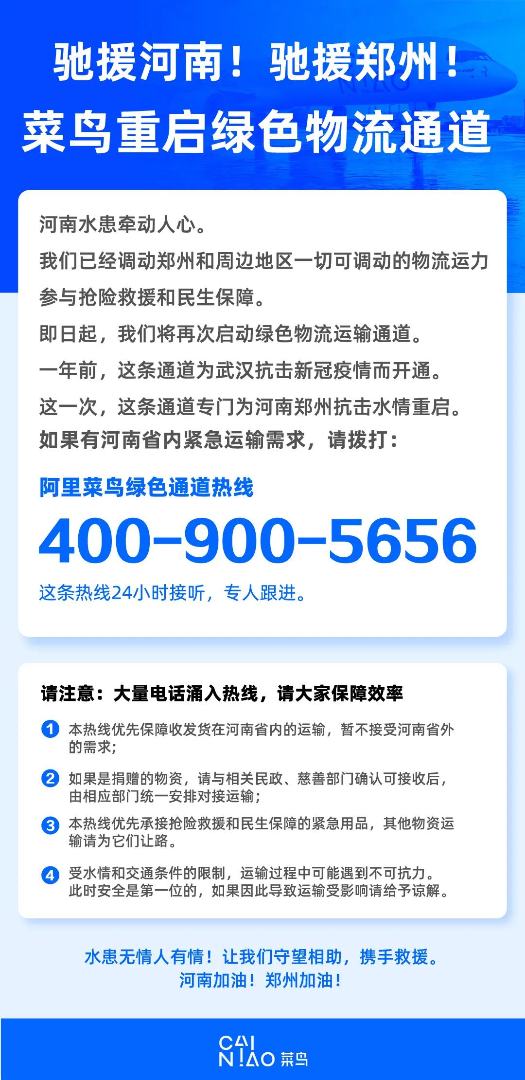 即時起全力調配運力資源,為鄭州地區開通救援物資免費運輸通道,提供物流服務和便民救助服務。